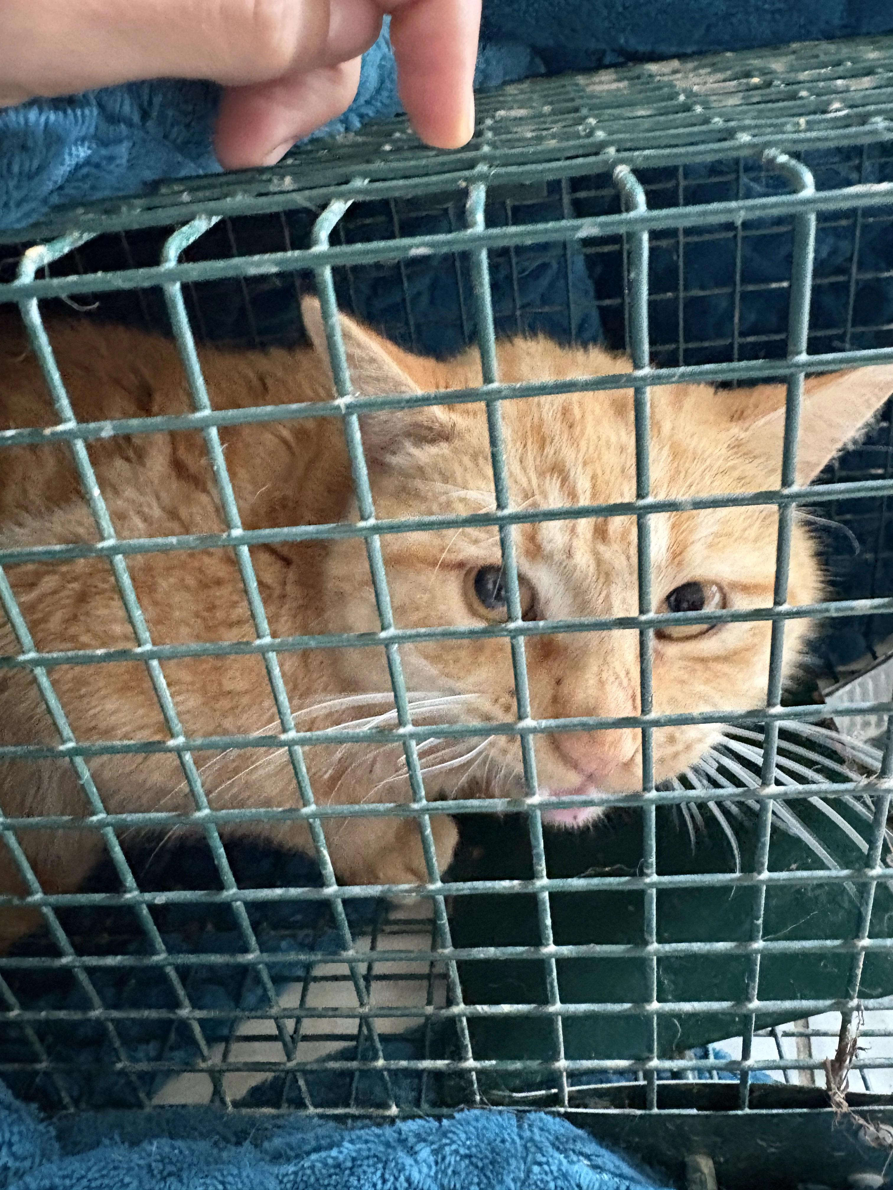 As I mentioned before no one else around me has an orange cat so here’s Toast in the trap ready for the vet.