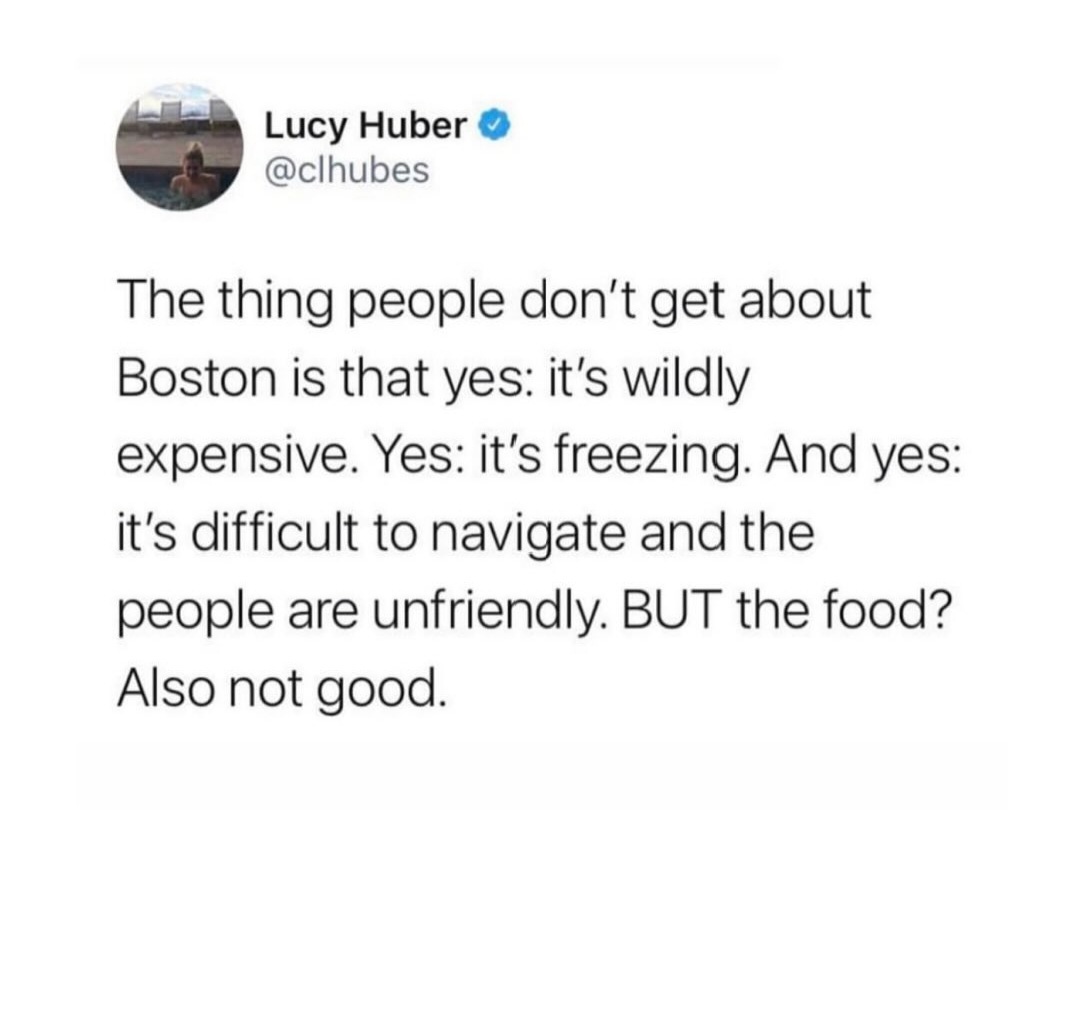 Boston has better food than your average city. It’s a relatively rich city, which helps. More importantly, it has something like 40 universities in and around that area, and many of them cater to international students. So, you get all kinds of interesting ethnic foods from around the world. Boston also has a small Chinatown, but it has great food. It also has a lot of Brazilian immigrants, so it has restaurants catering to Brazilians.