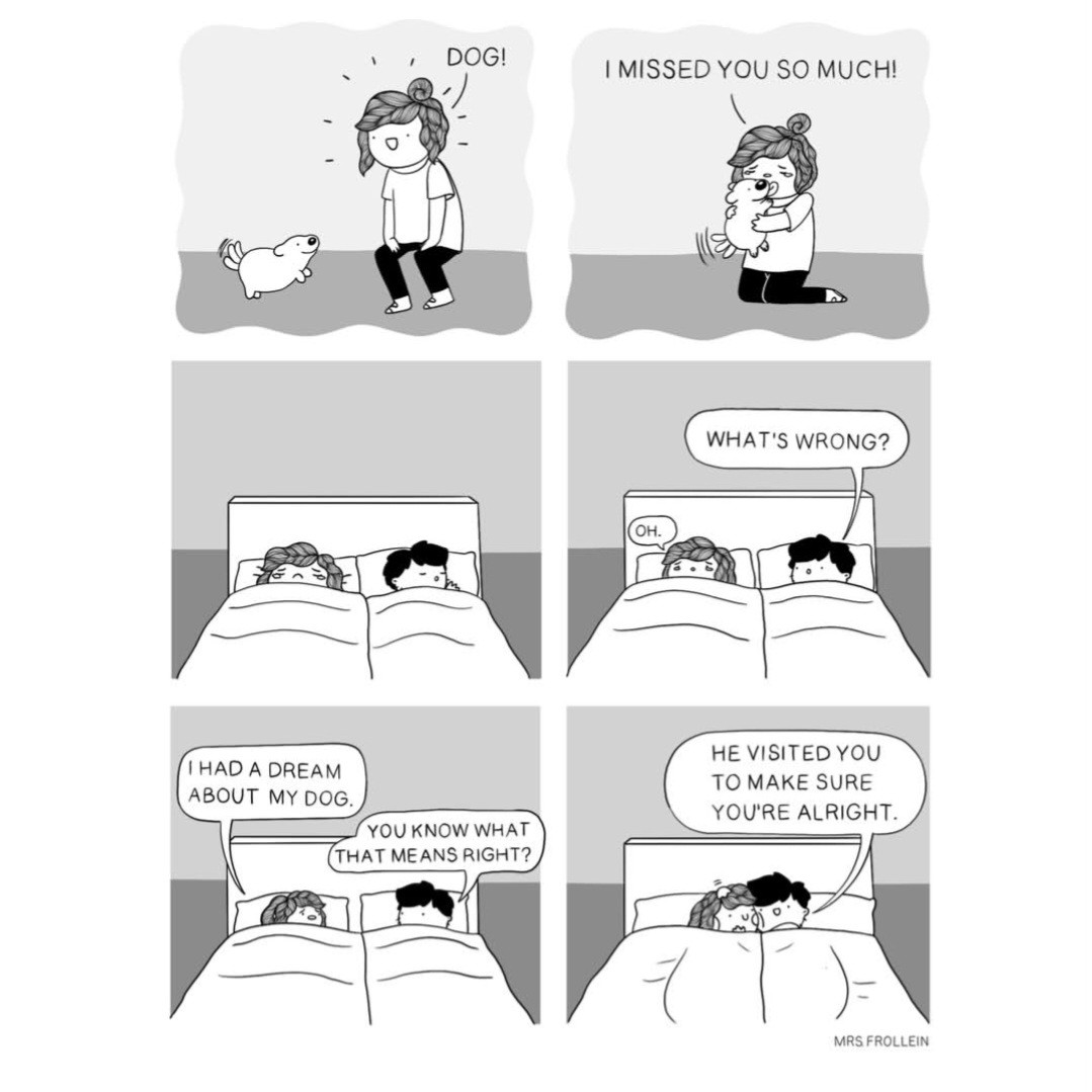 When I dream my late dog who passed unexpectedly, it’s often very distressing, because I somehow know she will leave me again and I need to protect her. I usually end up crying in sleep.