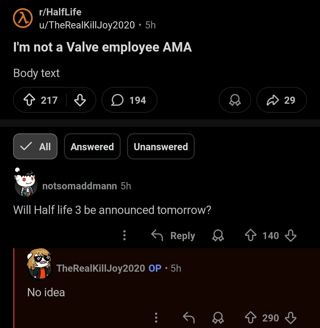 patrlim@lemmy.blahaj.zone to Memes@lemmy.mlEnglish · 1 day agoHalf Life 3 tomorrowlemmy.mlimagemessage-square5fedilinkarrow-up1210 cross-posted to: memes@sopuli.xyz