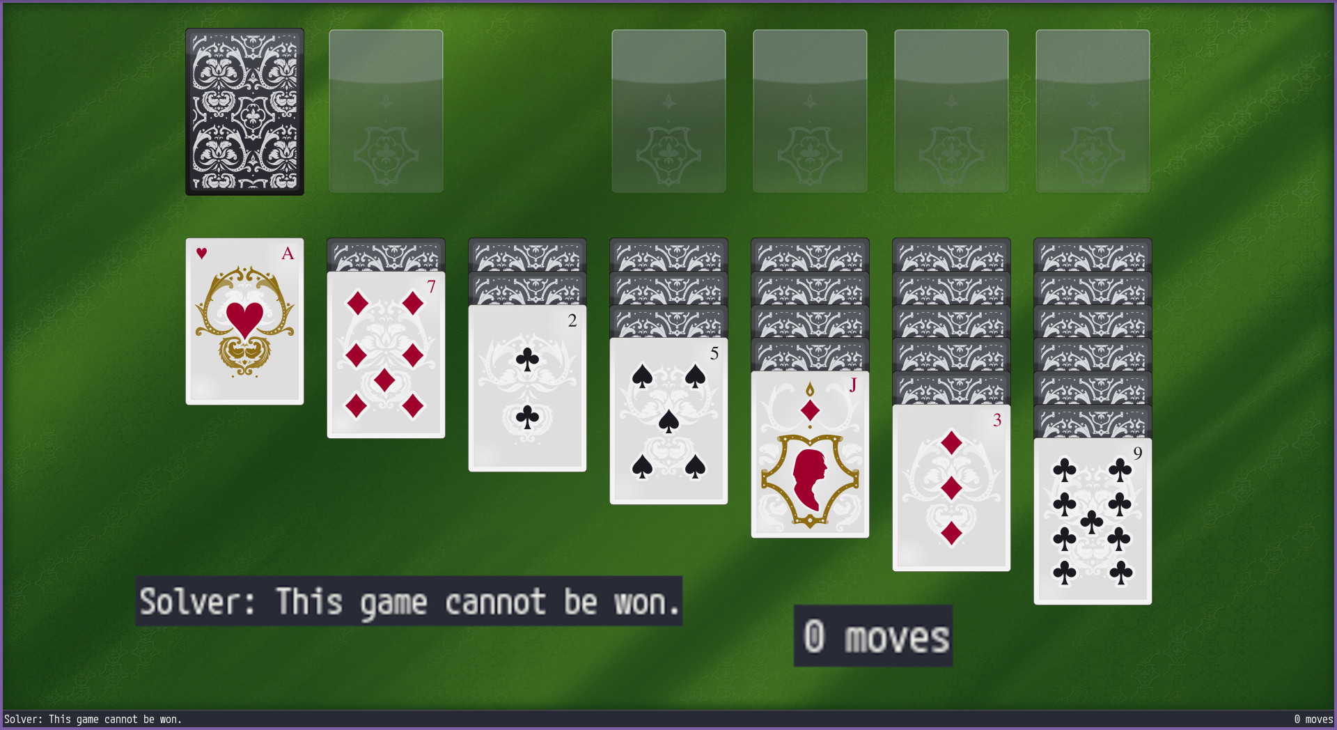 It also occasionally generates one where it can’t determine whether the game is solvable or not, which is probably due to search space limitations. I’ve won a couple of those, but they’re risky to start in the first place!