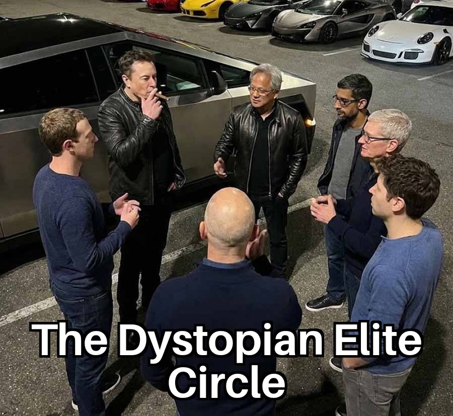 Two things i noticed is Jeff’s right ear/hand amalgamation and the feet look funny to the right of sam altman (easier to notice without the meme text). The side blinker on the white car looks a little too embedded in the wheel well but I’m not familiar enough with luxury cars to say for sure if its odd.