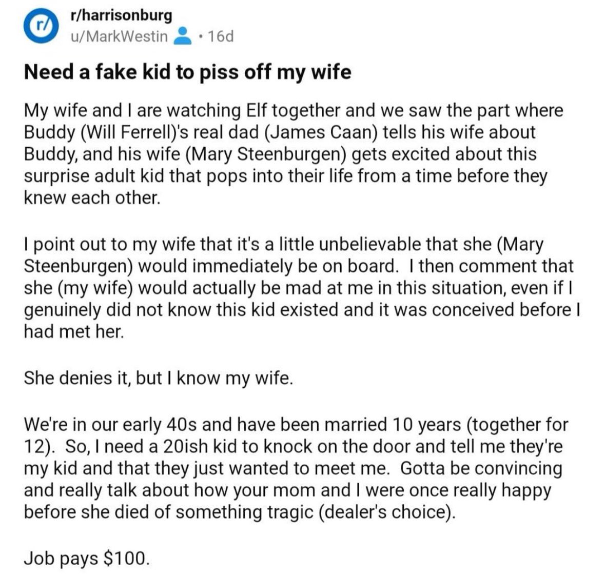 For those wondering, this played out well! OP found someone to take the job. His wife bit on the prank gleefully, was actually thrilled by the idea that OP had a son he didn’t know about. When the prank was revealed, she thought it was hilarious. Ultimately pretty wholesome, OP married a keeper.