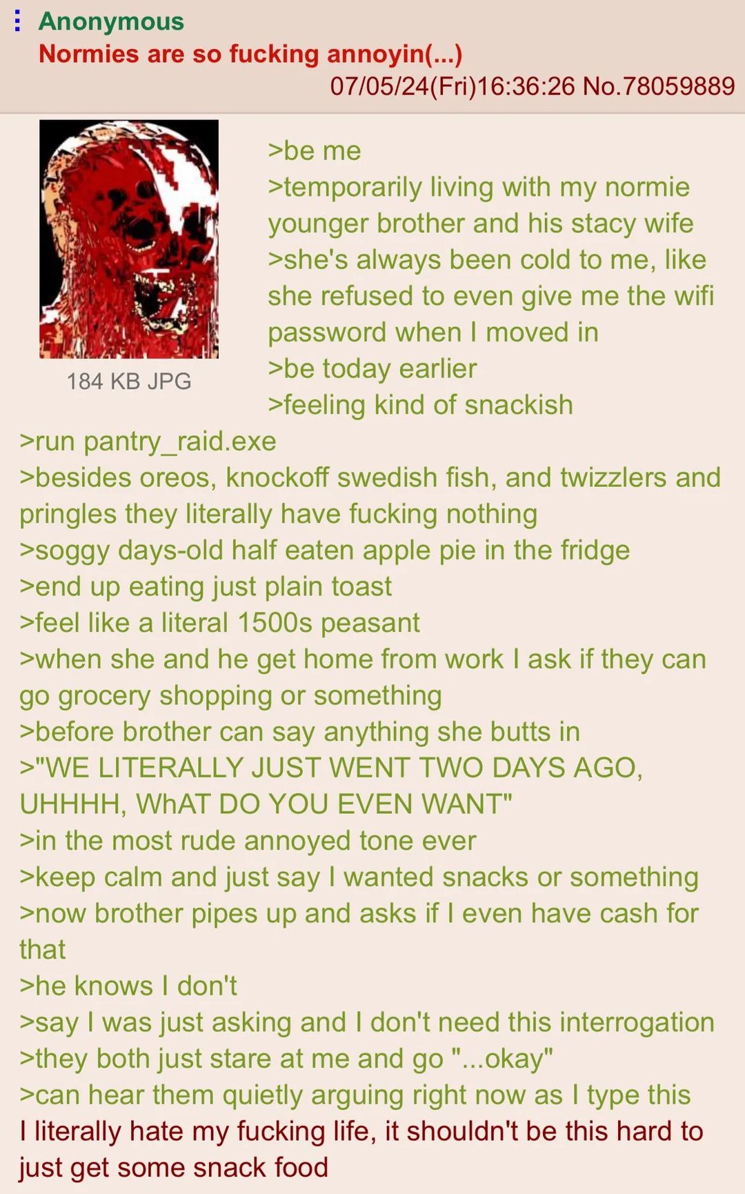 arrow-up10imageAnon wants snackssh.itjust.works🍹Early to RISA 🧉@sh.itjust.worksM to Greentext@sh.itjust.works · 2 years agomessage-square3fedilink