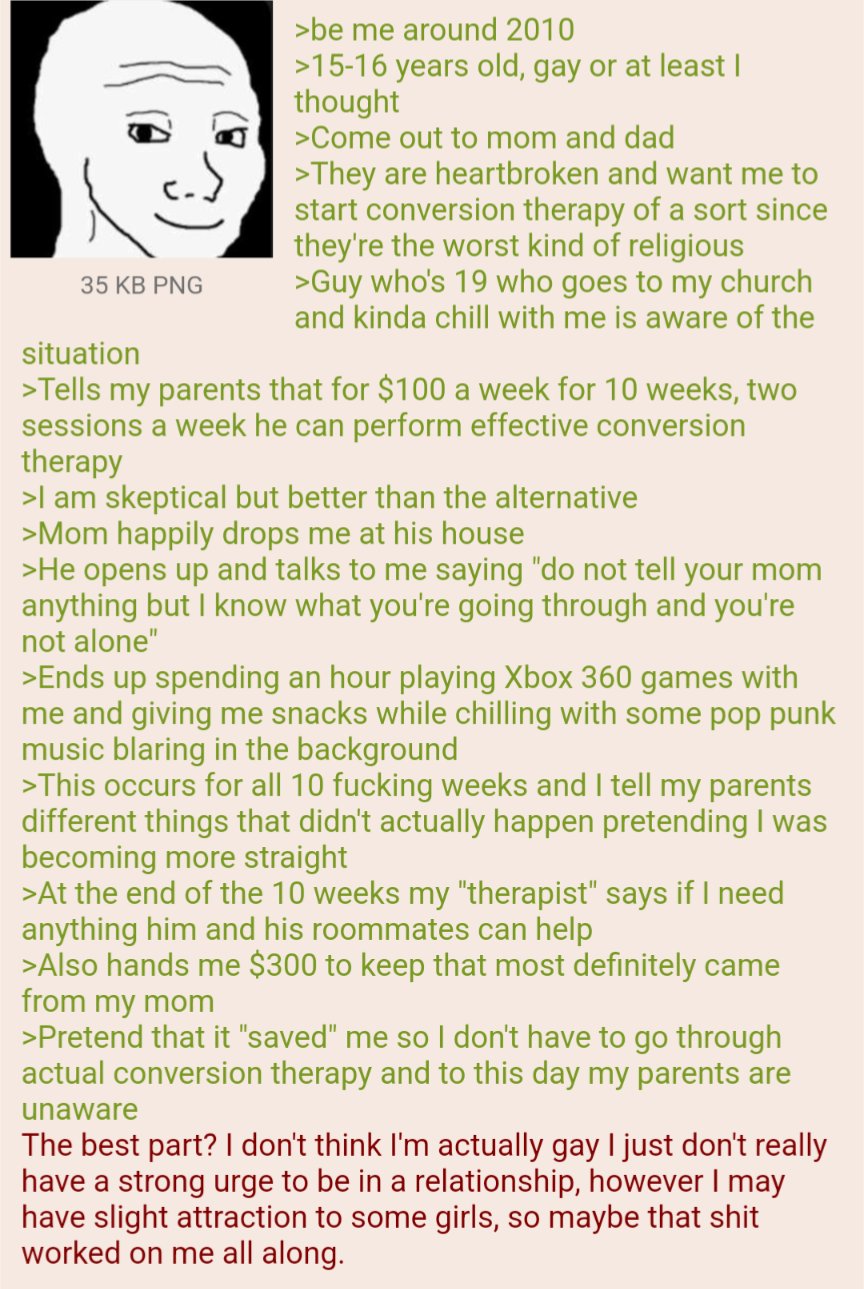 My buddy is this kinda goofy kid, never really fit in well, but ends up building a friend group in high school (including me). This group is unusually chill and inclusive for the era, and included three gay guys.