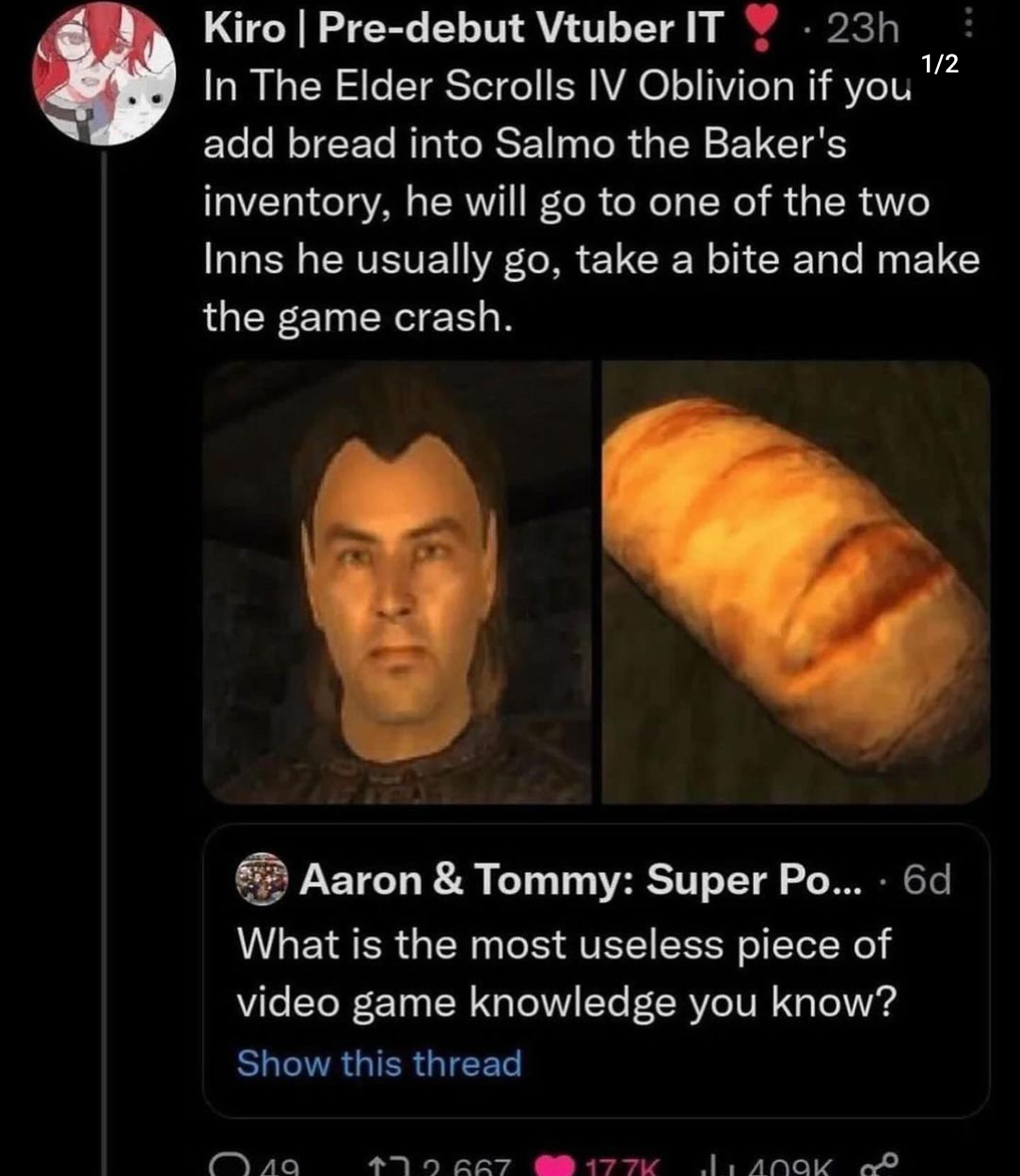 Salmo has two AI packages commanding him to take five loaves of bread to the Two Sisters Lodge at 10am and to the West Weald Inn at midday, but the packages never execute as he has no bread in his inventory and the packages are of “escort” type, meaning he doesn’t actively seek any out. It’s possible this bug was introduced to avoid another, more serious one: if bread is given to Salmo using the console or CS, he will walk to one of the inns as commanded, take a bite of bread, and the game will crash. (UESP)