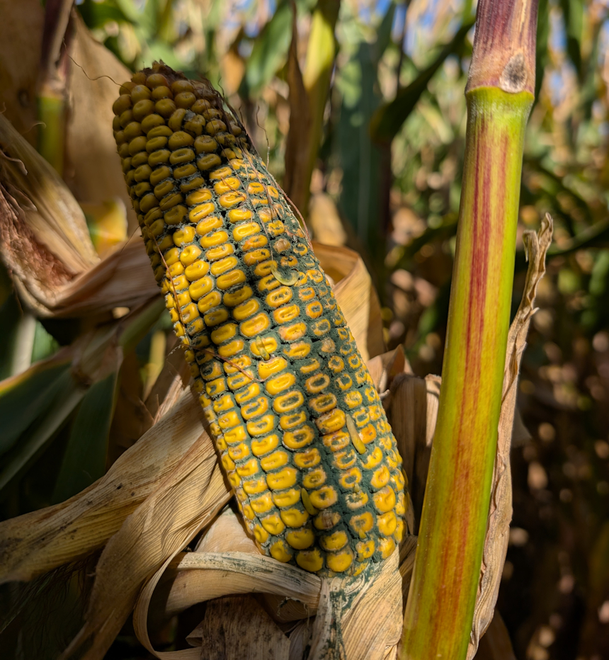 This here is trichoderma ear rot in an organic field. This 100 day variety was chewed on by an earworm. The damaged kernals allowed trichderma to enter and infect the ear. This ear rot produces many toxins and is a big no for consumption.