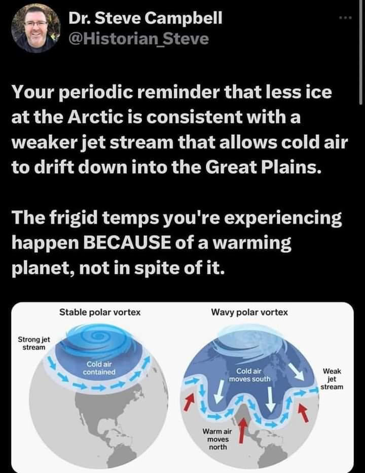 The solution to global warming, then, is clearly to just set up a massive ring of fans all pointed in the same direction in a ring around the North Pole, to keep the jet stream going