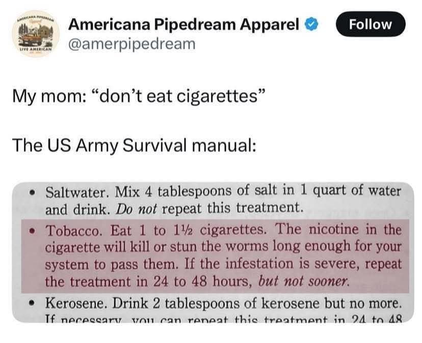 If you did them the other way, kerosene then cigs, well that would burn the parasite out, sure, but the host… well, it might hurt a little.