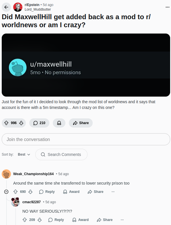 arrow-up1478imageReddit account allegedly belonging to Ghislaine Maxwell added back to r/WorldNews moderation team after she got transferred to lower security prisonlemmy.mlgeneva_convenience@lemmy.ml to Reddit@lemmy.world · 3 months agomessage-square77fedilinkfile-text