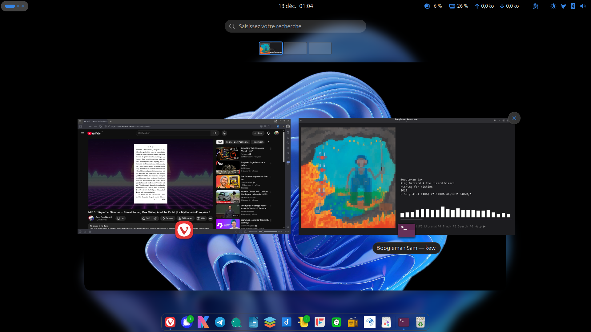 This is my Gnome desktop right now. Nothing too fancy, just the usual Gnome 49 with extensions (Blur my shell, AutoAccentColour, System Monitor, etc.), a Win11 inspired background and two apps running (Vivaldi browser playing a Youtube video and Kew music player in a terminal).