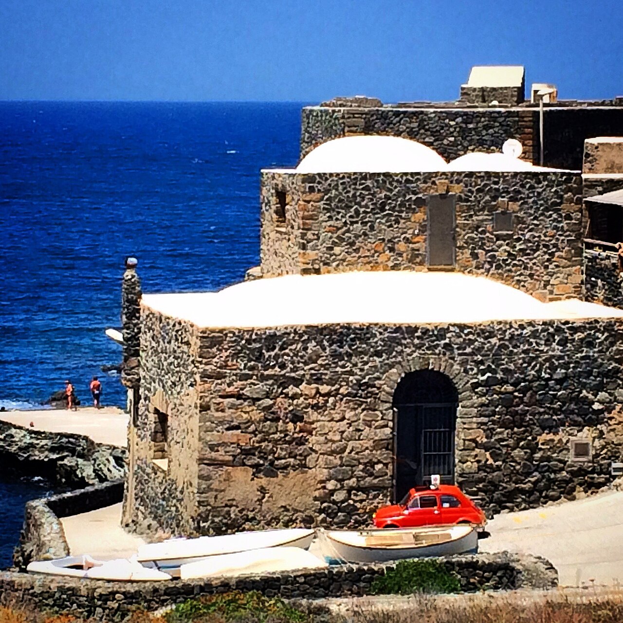 Thermal mass so stuff like stone, brick, earth or similar stores the average temperature. The more you have the longer the time period they average out over. So for in Panelleria the mean temperature in August is 26C and that is what those buildings keep over the entire day, even though it can get as hot as 34C during the day. If you have more thermal mass, for example in caves or underground structures, you can have the mean temperature of an entire year.