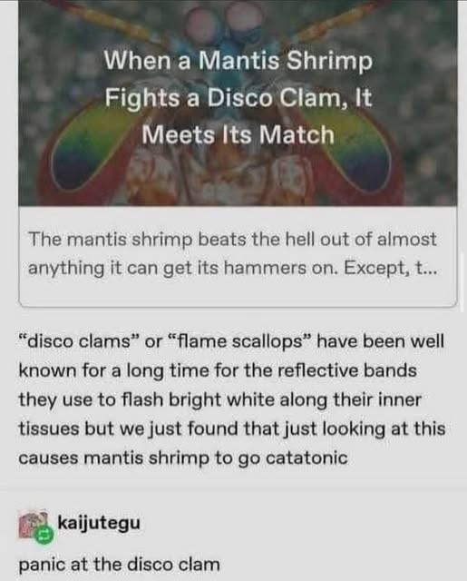 cm0002@suppo.fi to Funny@sh.itjust.works · 2 days agoWhen a mantis shrimp fights a disco clamsuppo.fiimagemessage-square20fedilinkarrow-up1360