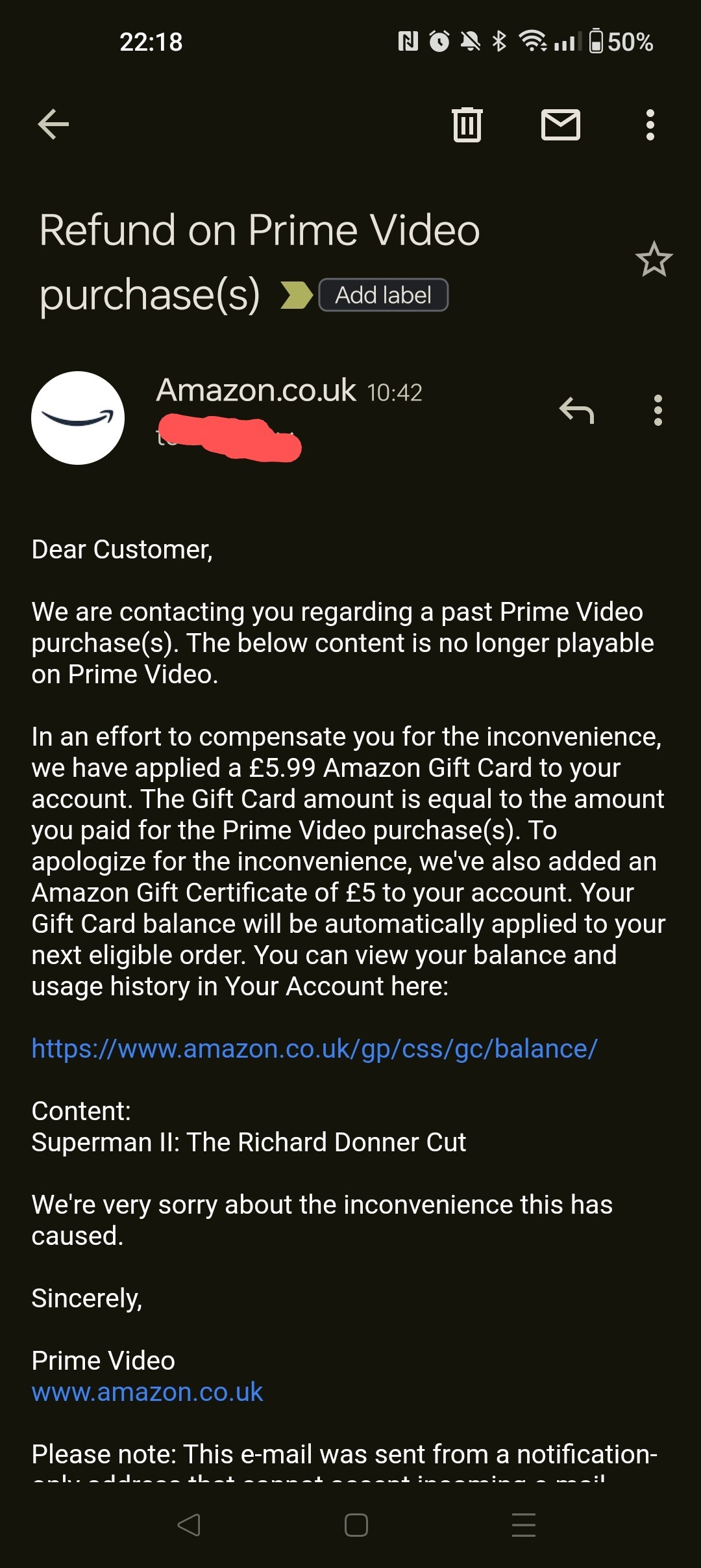 In an effort to compensate you for the inconvenience, we have applied a £5.99 Amazon Gift Card to your account. The Gift Card amount is equal to the amount you paid for the Prime Video purchase(s). To apologize for the inconvenience, we’ve also added an Amazon Gift Certificate of £5 to your account. Your Gift Card balance will be automatically applied to your next eligible order. You can view your balance and usage history in Your Account here:
