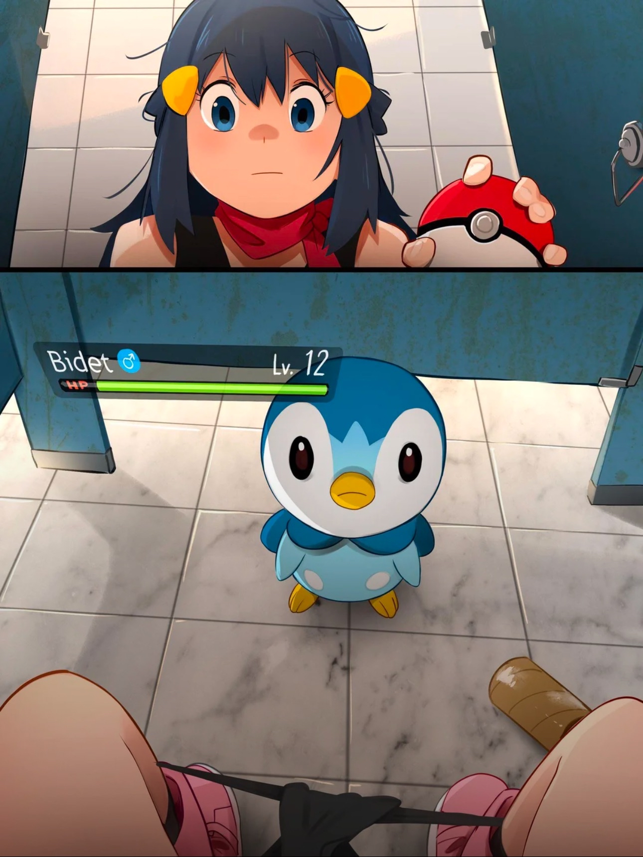 Well I’m an oblivious idiot. I thought she was caught literally with her pants down by a wild Pokemon wandering under the stall door and was determined to still catch it anyways