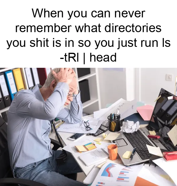 findrecursively lists (only) all regular files (-type f) starting in the current directory (.) and runs thelscommand (-exec) to show details (-l) of each file passed as arguments ({} +), including a specific, sortable time format (--time-style). The resulting comprehensive list of all files is thensorted in reverse (-r) order, using the sixth whitespace-separated column of each line/file as the key (-k6), which just so happens to be the “sortable time format”. Lastly, only the 10 most recent files are shown (| head), as before:find . -type f -exec ls -l --time-style=+"%Y-%m-%dT%T" {} + | sort -r -k6 | headRunning this is a great way to start your day! It’ll give you ample time to brew some coffee or tea, slip into your most comfortable programmer socks, and finish lunch by the time it scanned your 18.3 TB of furry smut to show you what you “touched” last.