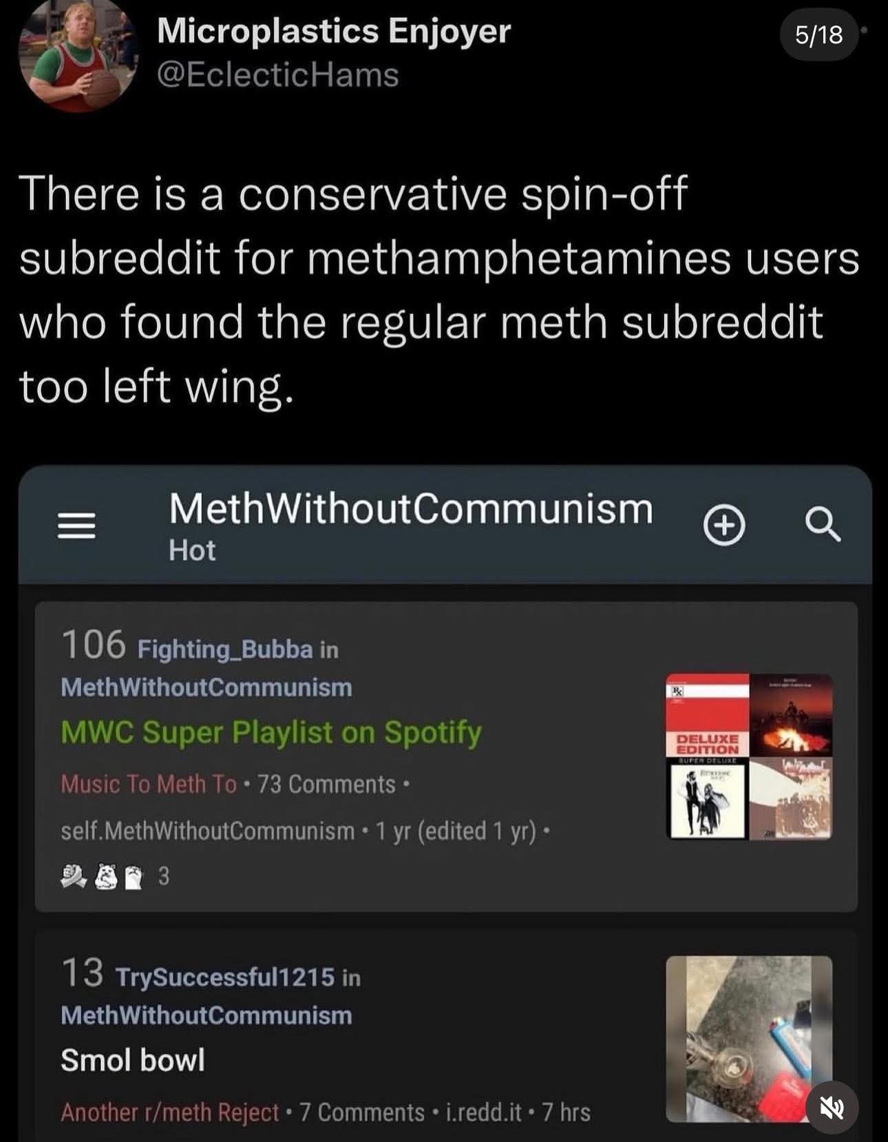 Yeah and it’s not even a stims thing. I’ve seen progressives down Adderall between shots and do coke. But the one meth user I’ve known was a queer republican who tried to lie her way into relationships with people.