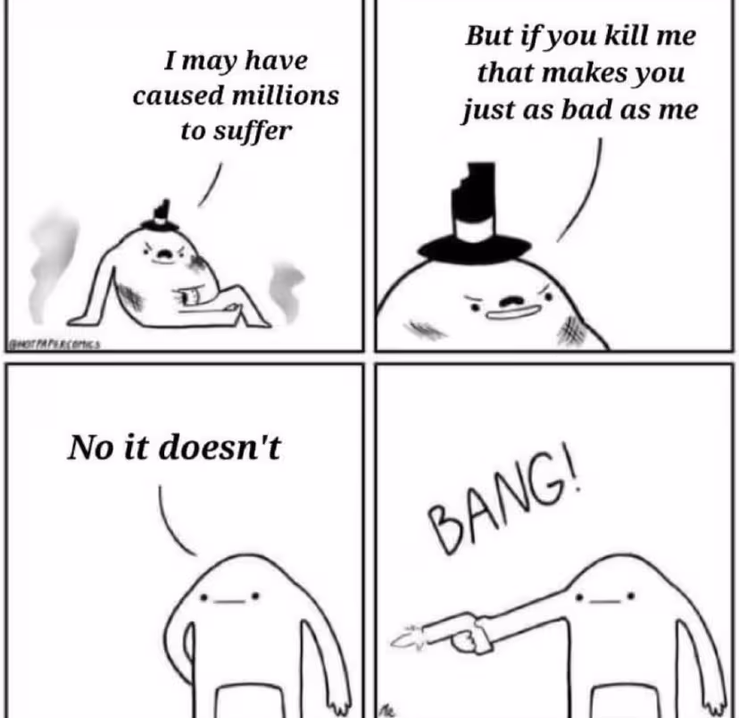 I was thinking more in the sense of the villain giving their little speech to a protagonist that hasn’t ever killed anyone that “If you kill me then your just like me, you’ll be equally bad even though I’ve killed thousands and my death would actually be of benefit to the world.”