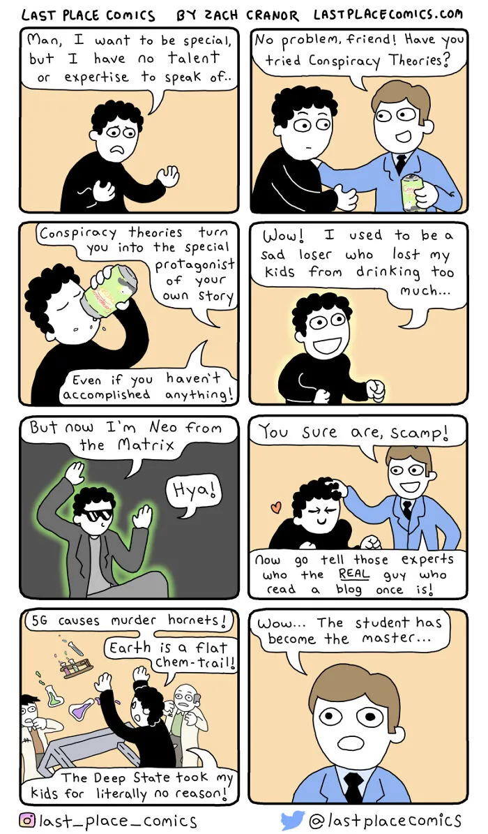 Conspiracies exploit our fundamental desire to belong to a social group and feel connected to others. They often divide the world into “us” (the ones who know the truth) and “them” (the powerful elites who are hiding the truth). This division creates a sense of belonging and solidarity—that is, relatedness—with others who share similar beliefs.