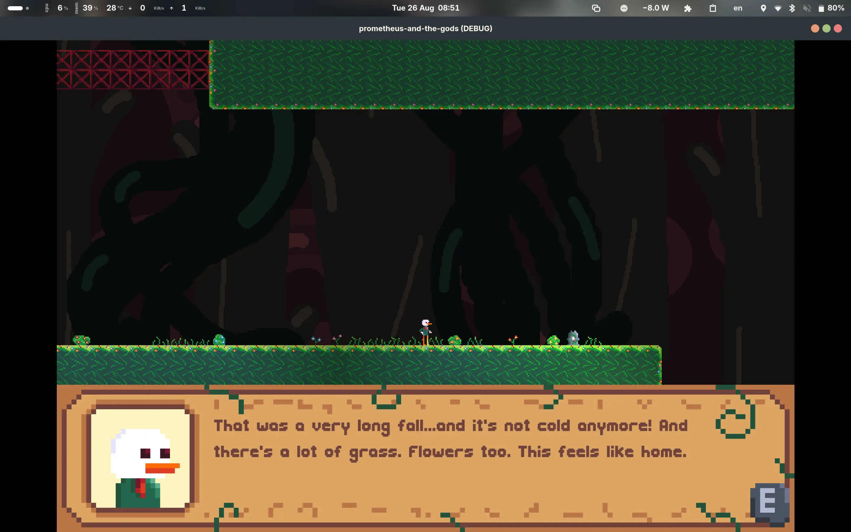 Hi all, I’m currently working on a hobby project currently titled “Prometheus and the Gods” (but will be changed at a later date to reference the duck), where you are tasked by Prometheus, the Titan who stole fire from the gods, to infiltrate in the worlds of the twelve (Greek) Olympian gods and steal their power for the humans (e.g. mastery of the seas from Poseidon). In addition, the player is a duck, which is kind of fun.