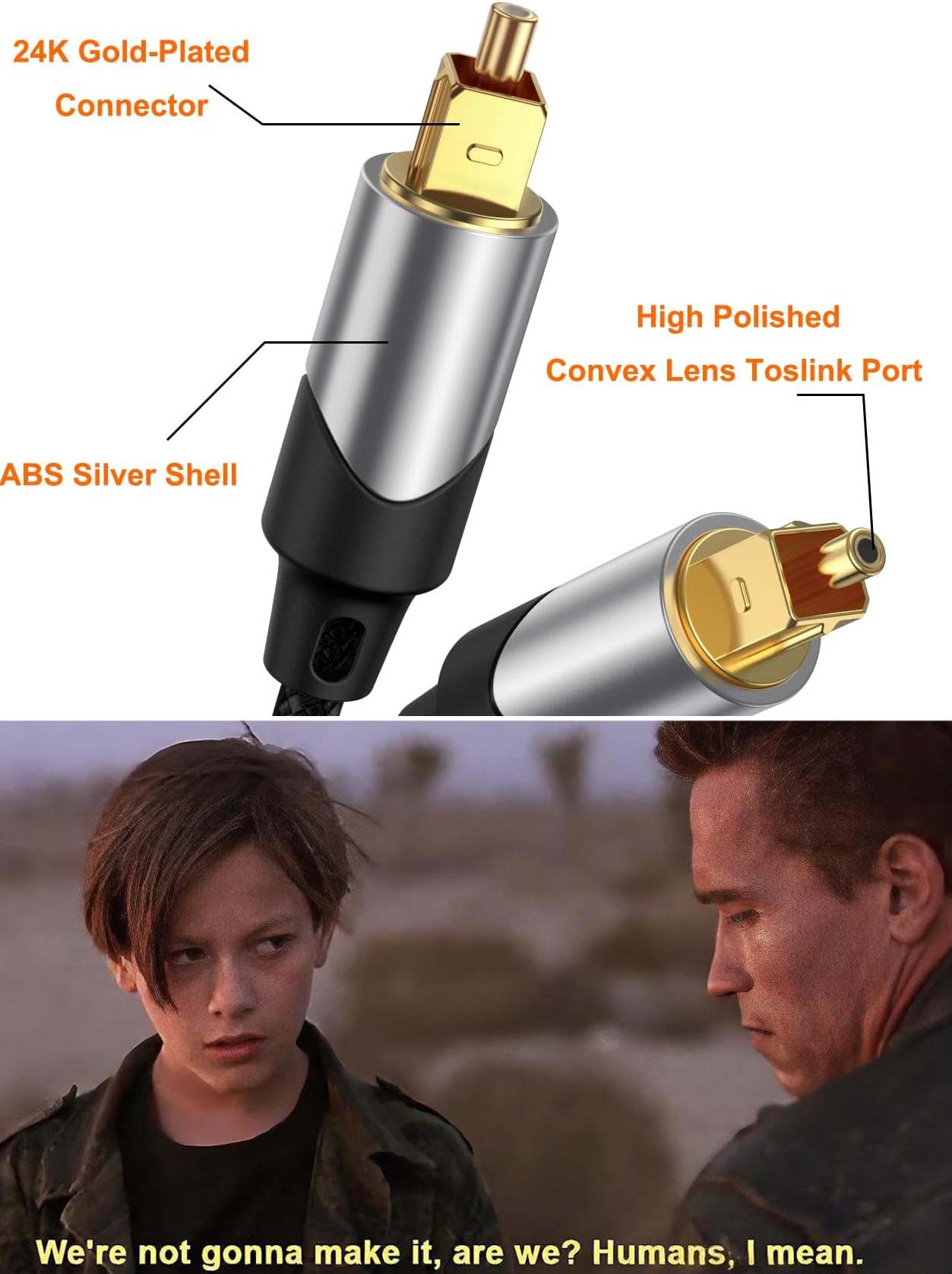 So regardless of the fact that it’s about an optical connector here, and hence completely nonsensical, gold is actually a worse conductor of electricity than copper or silver. The point of gold plated connectors is not so much to improve the immediate audio quality, but to prevent oxidation of the connector over time, which can degrade quality and lead to bad contact. Gold is a noble metal, so doesn’t oxidize. I would think most audiophiles know this?