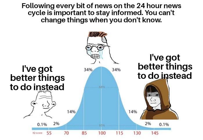 I help my community by donating clothes and food, and I donate heavily to progressive causes and campaigns. I really don’t think reading every little bit of information about how the world is falling apart really helps me, and I reject the idea that’s connected to making the world better. If I had more money and could act at a global scale, maybe. But I don’t.
