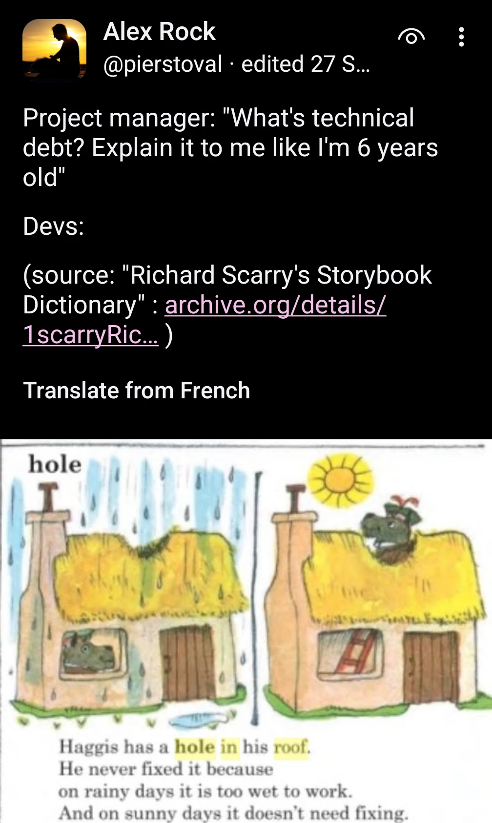 Perfect ELI6 😂 Tech debt is that leaky roof: you can ignore it for a while, but every new ‘feature’ gets harder until you finally fix it.