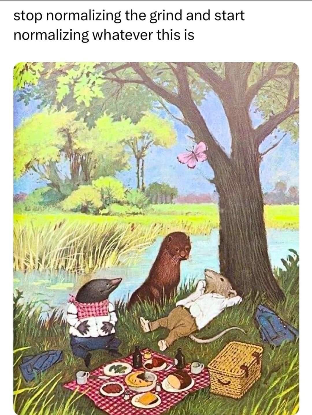 You are overthinking about a meme. There is nothing stopping you and 3 people from having a picnic in the park. I could do it every week. Someone unemployed getting the benefit could do this every week. Thinking that the current economic system is preventing people from this is insane.