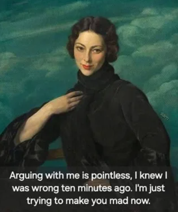 The word and associations that came to mind when I saw the image and upvoted were not “a woman is saying this, and I know because this is what women do.” What I thought was “a person is being depicted as petty af while pretending to be so classy, and that is so relatable.” Much like I do when I watch a drag queen say some unhinged shit, and then they give a sly smile and fan themselves as if they coudln’t believe that came out of their mouth. It’s campy humor.
