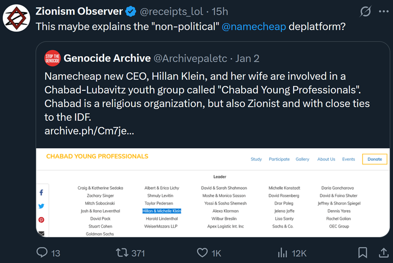 Domain registrar NameCheap bans Zionism Observer website two weeks promoting new Israeli linked CEO Hillan Klein