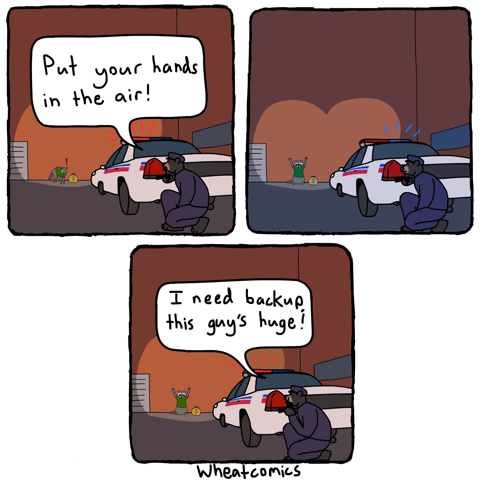 I don’t think so. The joke is that you’re supposed to put your arms up in the air to appear bigger when you run into bears, so bear-cop is suddenly intimidated when the perp does it.