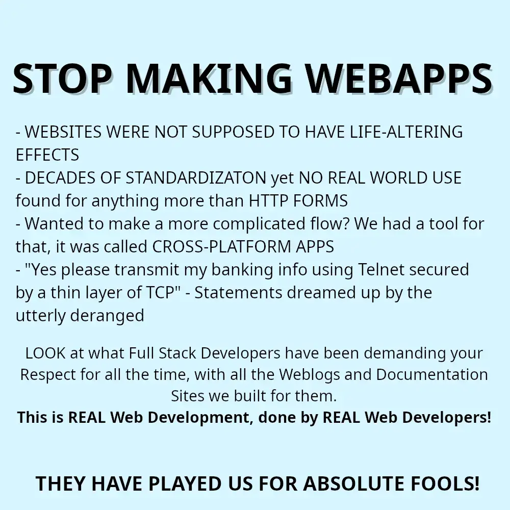 I tried to get on board with this one, but “cross platform apps” made me throw up in my mouth a little. The unholy things we did back then are best left forgotten in their shallow binary graves.