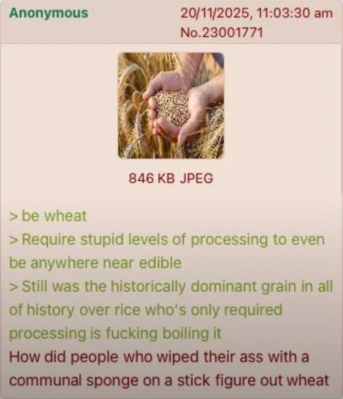 Boiled wheat is perfectly edible, actually. Tasty? Not really, but I didn’t grow up on it and we’re extremely spoilt compared to prehistoric peoples. Stuff like boiled barley kernels (AFAIK you can’t really make bread with barley) was still a relatively common dish 1-200 hundred years ago in my parts.