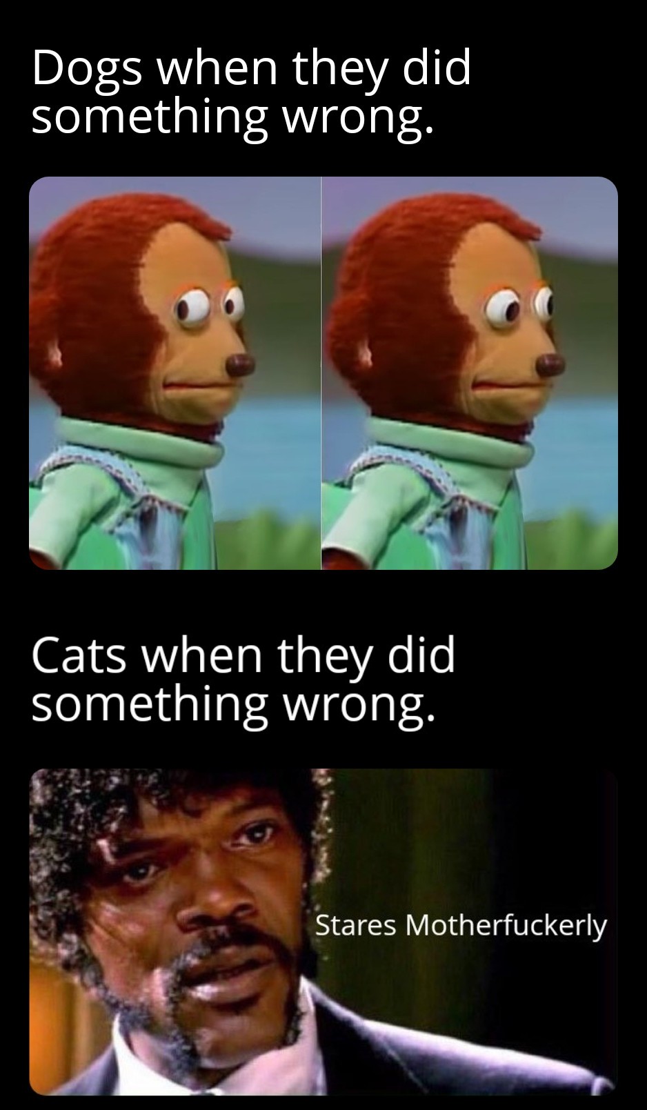 minus-squarefoggy@lemmy.worldlinkfedilinkarrow-up18·4 天前The dog did it by mistake because he’s a doofus. The cat did it on purpose because 6 weeks ago you stopped scratching his butt sooner than he would’ve liked.