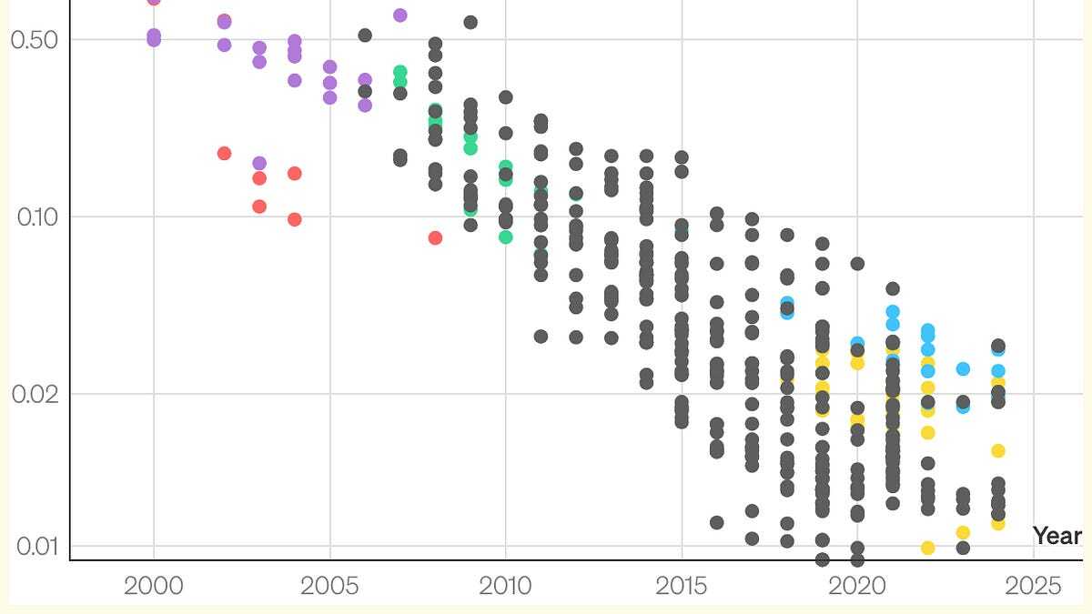 The plot below shows the price of TVs across Best Buy’s Black Friday ads for the last 25 years. The units are “dollars per area-pixel”: price divided by screen area times the number of pixels (normalized so that standard definition = 1). This is to account for the fact that bigger, higher resolution TVs are more expensive. You can see that, in line with the inflation chart, the price per area-pixel has fallen by more than 90%.