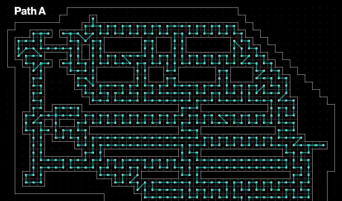 In retrospect it’s pretty obvious that the most efficient way to traverse a grid would include no diagonals. Every time you move on an axis you move to a cell in 1 unit distance of travel. Why would you ever choose to move to a cell in √2 unit distances when you could move 1 unit distance to achieve the same result of covering one more cell?