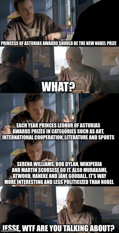 And yeah no totally, my post was all about prognostication. You’re so right. My comment was absolutely telling people to predict the future and not at all about the IRONY of moving away from Nobels and to a different awards system that 20 years ago gave a peace prize to a women who would go on to launch a literal hate campaign.