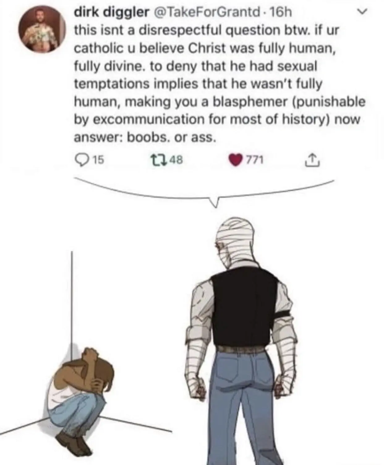 Alternatively, if we go by the theory that he was gay for John the Apostle, that gives us an answer too. (I assume John didn’t have boobs.)