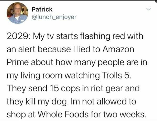 Whole Foods is also the only Food distributor. Let’s hope you skipped some meals to save some of your rations for such an emergency. Saving rations is also punishable by death.