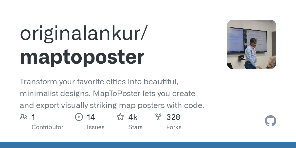 GitHub - originalankur/maptoposter: Transform your favorite cities into beautiful, minimalist designs. MapToPoster lets you create and export visually striking map posters with code.