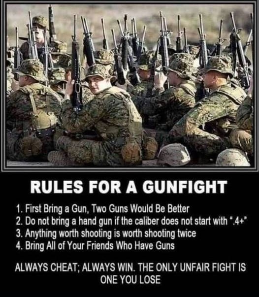 arrow-up1275imageRules for a gun fightlemmy.worldSine_Fine_Belli@lemmy.world to Lemmy Shitpost@lemmy.world · 1 day agomessage-square38fedilinkfile-textcross-posted to: memesforliberalgunowners@lemmy.world