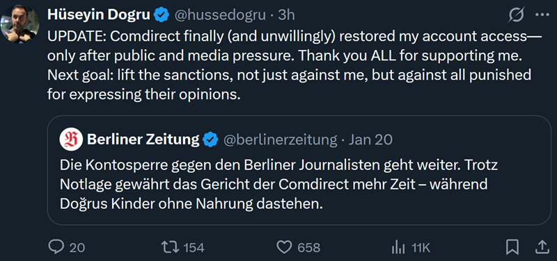 arrow-up11imageAfter public pressure a German bank restores access of EU journalist who got sanctioned by the EU for criticizing Israellemmy.mlcm0002 to Europe@lemmy.dbzer0.comEnglish · 6 hours agomessage-square1fedilink