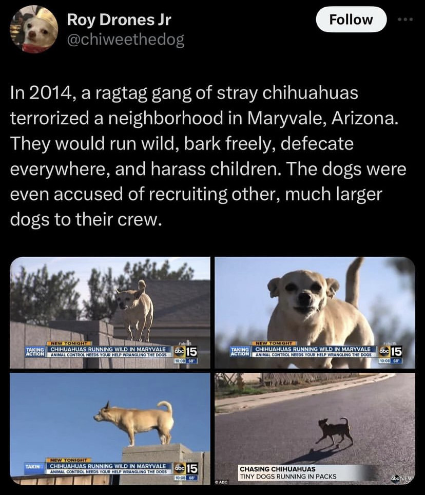 ickplant@lemmy.world to Lemmy Shitpost@lemmy.world · 12 days agoChihuahua ganglemmy.worldimagemessage-square8fedilinkarrow-up1294
