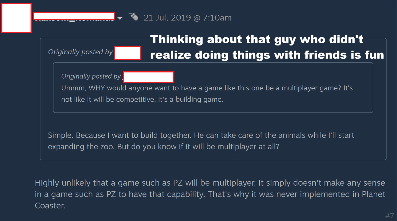 For Project Zomboid that take is obviously stupid. But any builder where you’d share a bank account or otherwise a shared bank of resources gets a hard No from me, too. You’re always waiting for the bank account to fill up for the thing you want to build while the other person is throwing money away. Best-case scenario is you’re taking turns, with one person not doing much while the other builds.