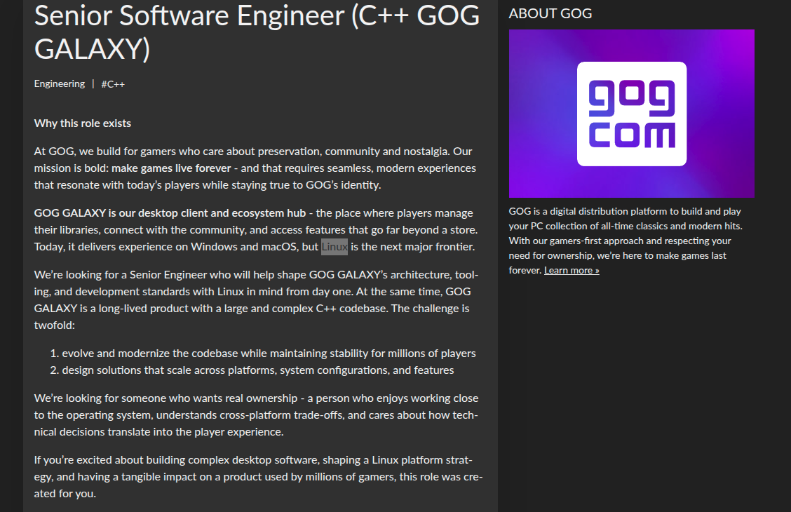 mr_MADAFAKA@lemmy.ml to Linux Gaming@lemmy.worldEnglish · 17 days agoGOG is seeking a Senior Software Engineer with C++ experience to modernize the GOG GALAXY desktop client and spearhead its Linux developmentlemmy.mlimagemessage-square167fedilinkarrow-up11.15Kfile-text
