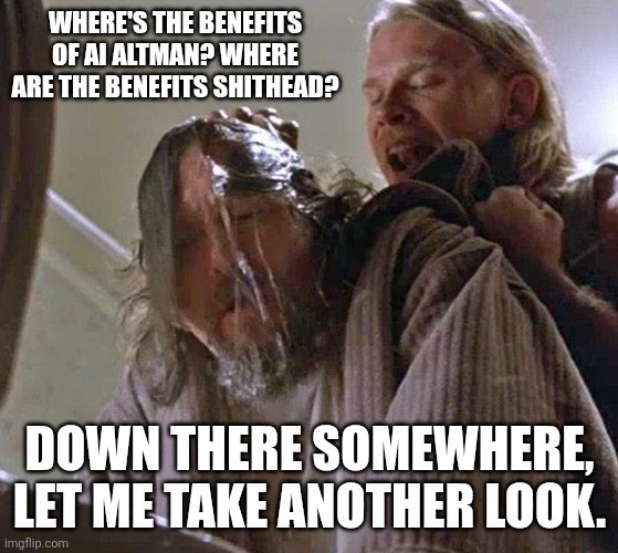 These thugs break into his apartment to rough him up because he has the exact same name as a rich man whose trophy wife has been taking money from a loan shark/porn producer and they’re trying to intimidate him into paying them back (by breaking his shit and drowning him in the toilet). Except the thugs are dumb asses who got the wrong Jeffery Lebowski.