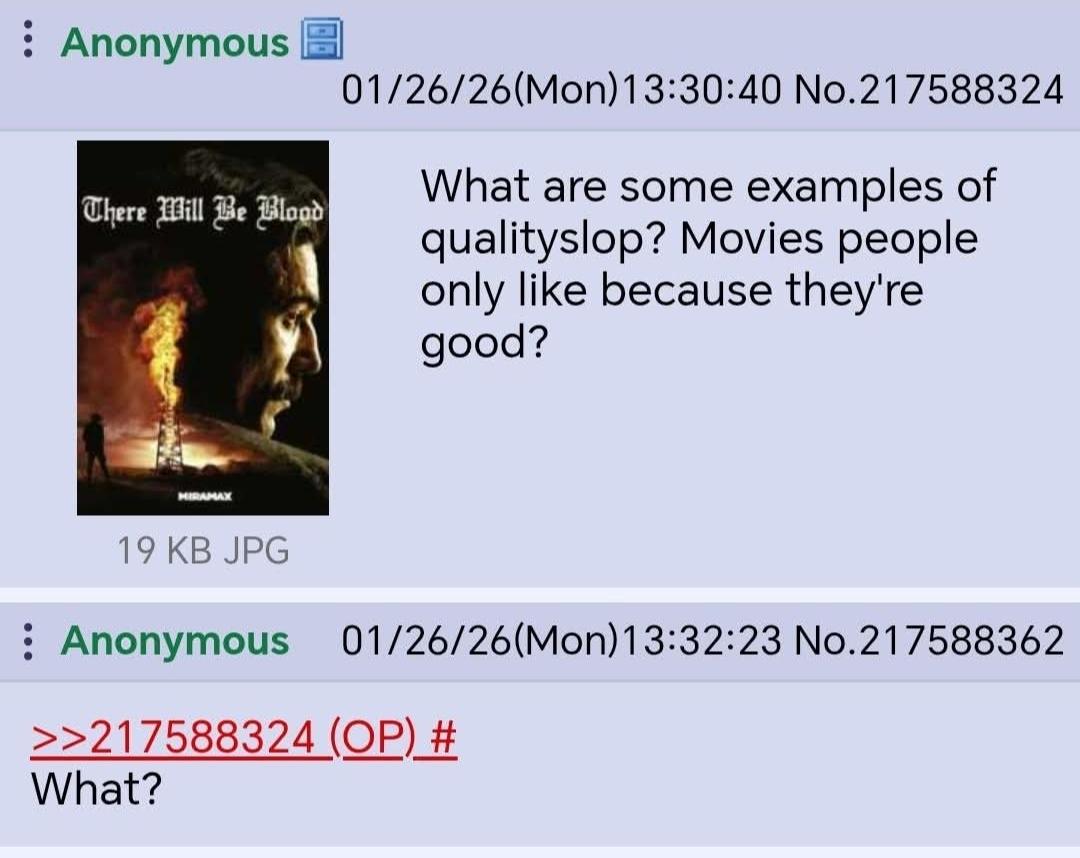I thought Anon meant movies that people say they liked because of their undeniable, objective quality, but not genuinely enjoyed watching. I guess they’re saying There Will Be Blood is some kinda masturbatory “quality porn”.