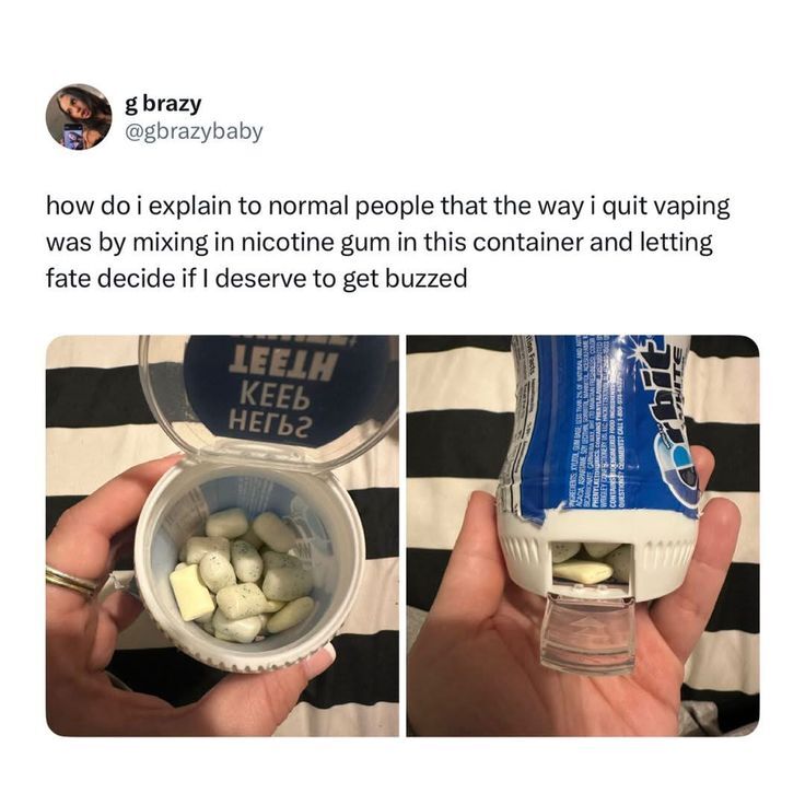 I’m not sure this works because you don’t chew nicotine gum like regular gum. I think you release the nicotine by chewing, so you munch on it a few times and then let it sit for a while.