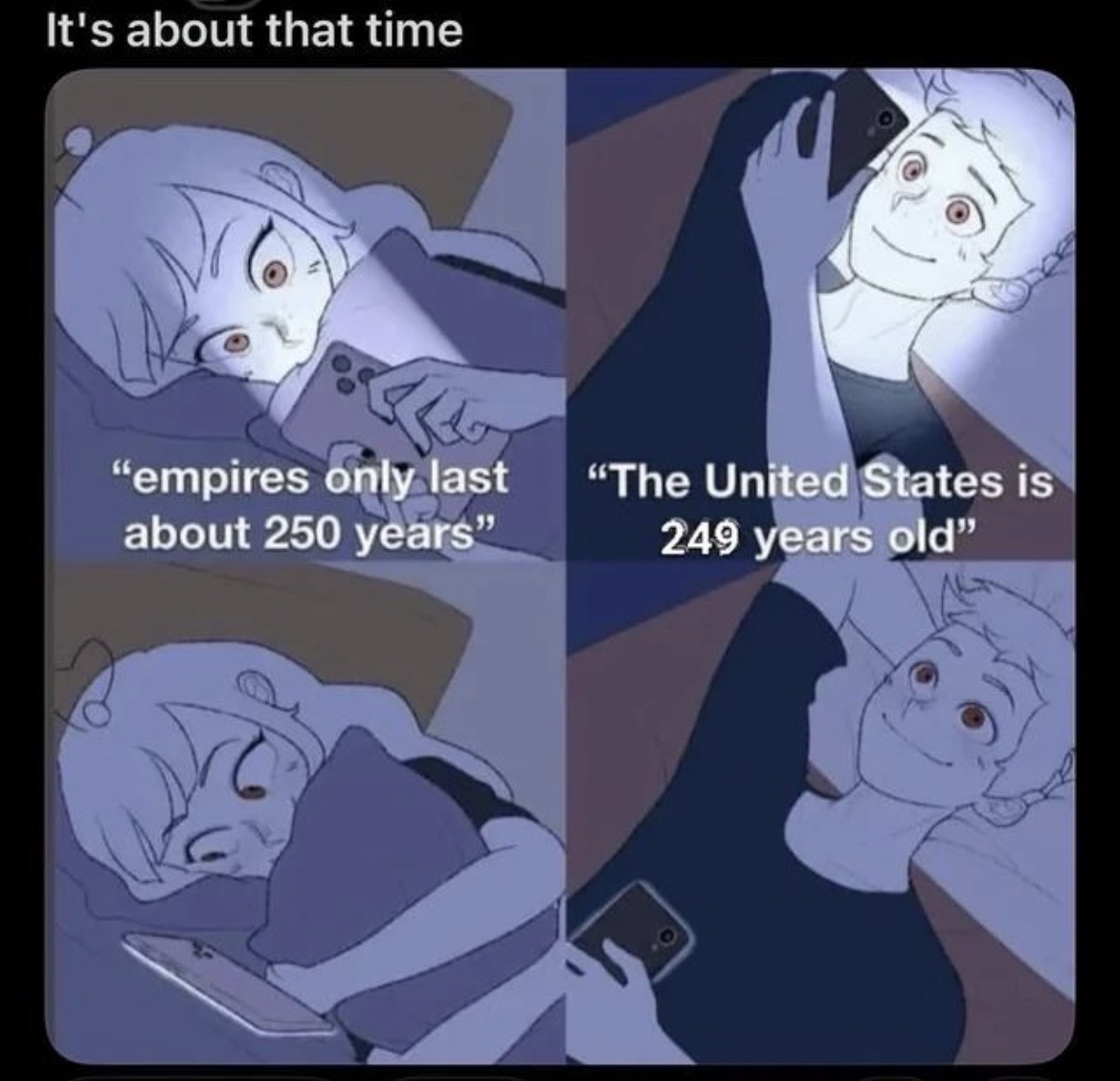 The 250 year timeframe is made up and even if it wasn’t the US couldn’t realistically be described as an empire until some time in the 1900’s. Until then it was “just” a genocidal colonial power like the others. I guess you could make an argument that it became an empire around the time of Teddy or the monroe doctrine, but I wouldnt