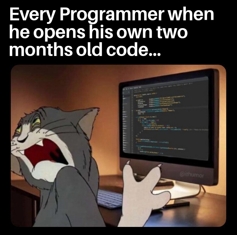 I really don’t understand this meme. As a longtime professional programmer I regularly go back and review code I wrote last month, last year and last decade; in order to find things I did wrong and learn from things I did right. Sometimes I do get the revelation of “oh, how much I’ve learned since then”, but that’s most often very far in the past and seldomly that I’d be ashamed of writing the same code again now, mostly just a welcome realization that I’ve been able to learn and improve since then.